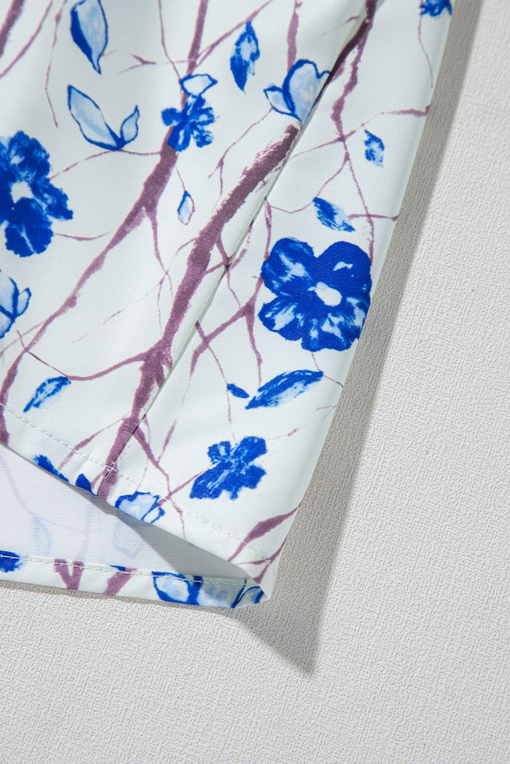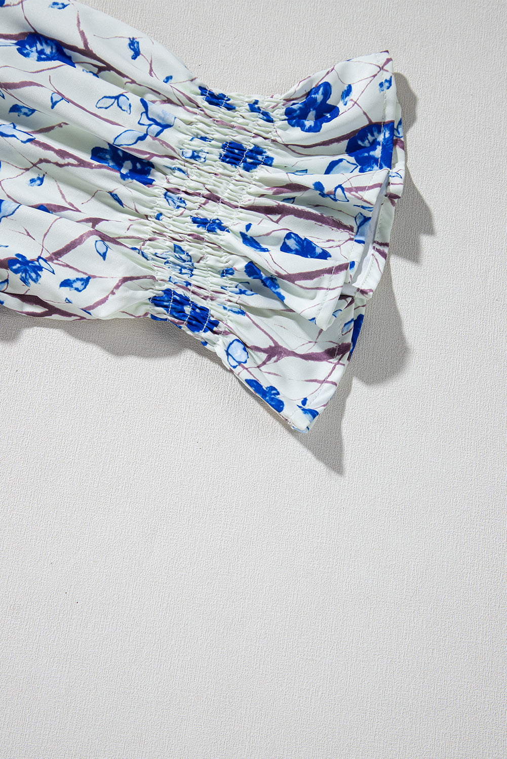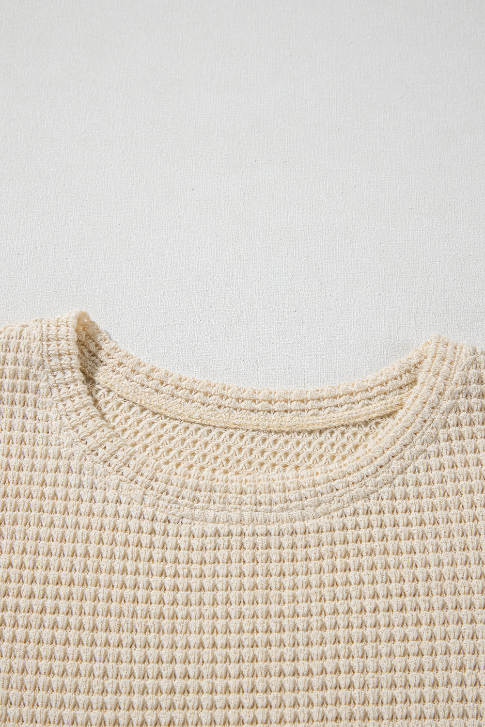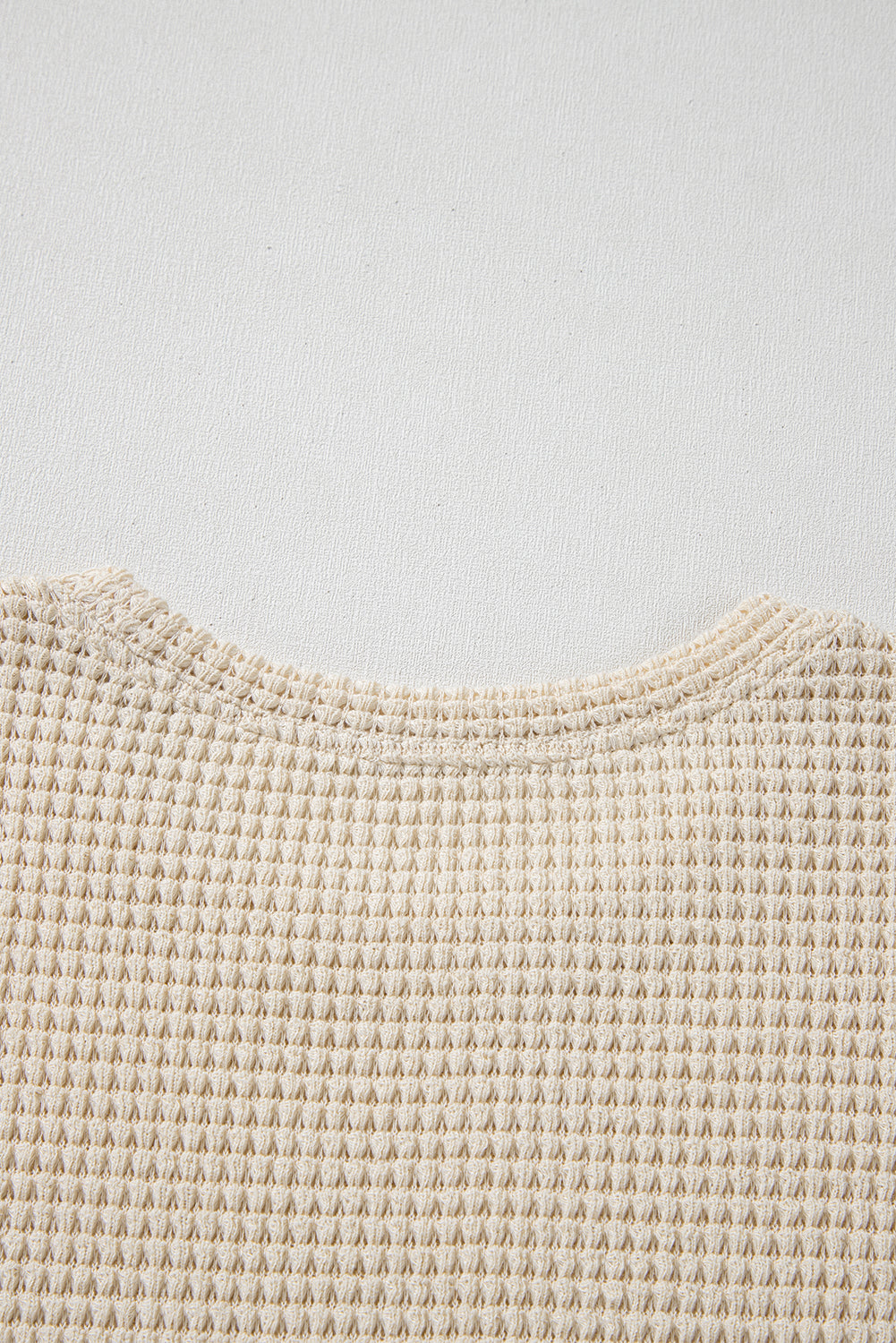 Beige Waffle Floral Patchwork Short Flounce Sleeve Peplum Blouse